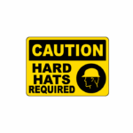 Alerts workers that hard hats are necessary for head protection. Helps reduce risks of head injuries from falling objects.