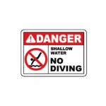 Warns against diving in shallow water, reducing injury risks. Common in swimming pools and beaches.