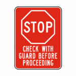 Remind individuals with this sign: Stop Check With Guard Sign. Suitable for community, facility, or private enforcement areas.